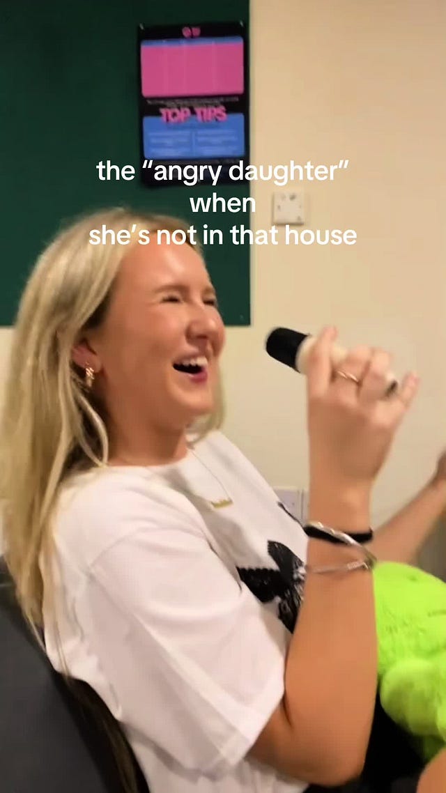 The video, as embedded above, is a highlight reel of a girl laughing, smiling, and having fun, with the text “the ‘angry daughter’ when she’s not in that house,” overlaid.